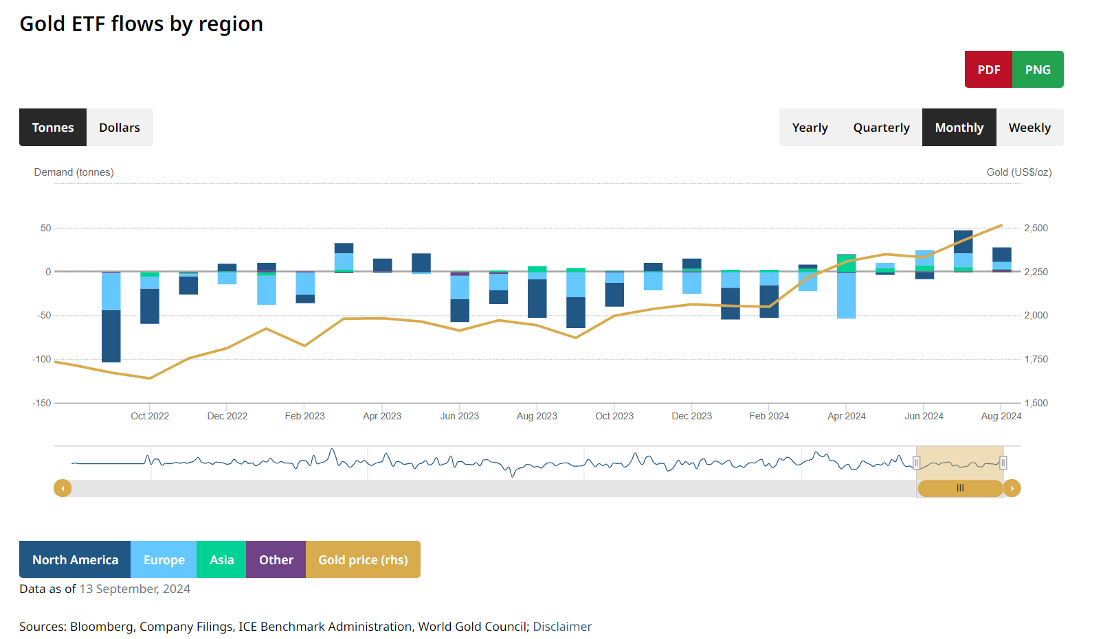 Les achats nets en or par les banques centrales ont continué d’augmenter au cours du premier semestre 2024. Ils ont atteint 483 tonnes soit 5% de plus que le précédent record du premier semestre 2023. Si la PBOC a montré un net ralentissement de ses achats au cours du deuxième trimestre, ceux-ci restent fermement tirés par les marchés émergents, en particulier par les banques nationales de Pologne, d’Inde et de Turquie. Aujourd’hui, les investisseurs semblent retrouver un intérêt pour l’or. Les flux d’ETF1 mondiaux sur celui-ci ont enregistré en août des entrées nettes pour le quatrième mois consécutif. Toutes les régions sont concernées mais c'est en Occident que la contribution a été la plus forte. Ainsi, l'Amérique du Nord a connu deux mois consécutifs de flux net entrant d’ETF sur l’or. La baisse des chiffres de l'inflation ainsi que le ralentissement du marché du travail ont fait baisser les taux réels aux États-Unis et ont ravivé l’intérêt pour ce métal précieux.