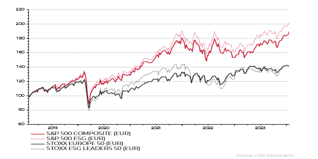 Sur ces quatre dernières années, alors que la place financière mondiale a été malmenée (pandémie, guerre en Ukraine, inflation, taux d’intérêt), on voit clairement que les versions ESG de ces deux indices phare se sont très bien comportés.