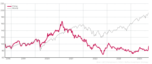 Les actions chinoises, sous pression depuis quelques années déjà, ont réagi très positivement à la nouvelle. Différents journaux ont dès lors parlé du «rebond» des actions chinoises. Il est important de mettre ce rebond dans son contexte. Le graphique ci-dessous montre le rendement à plus long terme des actions chinoises (en rouge), comparées aux actions mondiales (en gris).