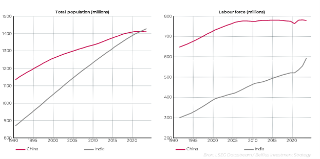 Tout d’abord, la Chine souffre d’une crise démographique. La population totale diminue (graphique de gauche) et elle continuera à le faire, selon les prévisions. De plus, la Chine est confrontée à un vieillissement de la population, de sorte que la population active n’augmente plus depuis déjà plus de 10 ans (graphique de droite). Cela contraste fortement avec l’Inde, par exemple, où les tendances démographiques sont positives. L’incitant monétaire ne peut pas inverser cette tendance à long terme.