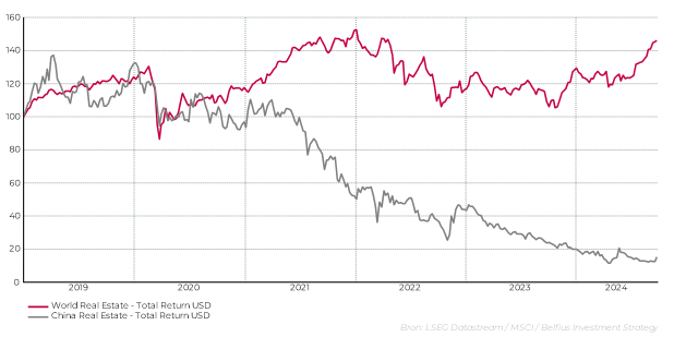 Par le passé, la croissance chinoise a été soutenue en partie par la construction d’infrastructures et de projets immobiliers, rendue possible par l’obtention facile de crédits. Cela a provoqué une bulle spéculative immobilière qui se trouve sous pression entre autres en raison de la diminution de la population. La faillite de quelques gros promoteurs immobiliers a fait sombrer dans la crise l’ensemble du secteur immobilier en Chine. Le graphique ci-dessous indique le rendement des actions immobilières chinoises, comparées au reste du monde.