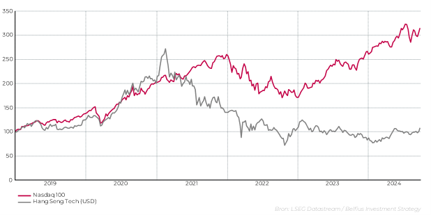 Le graphique ci-dessus compare le rendement des actions technologiques chinoises (en gris) au rendement du Nasdaq 100, un panier d’actions reprenant surtout des actions technologiques américaines. Depuis 2021, la situation en Chine est alarmante. La politique dure des autorités chinoises contre son propre secteur a effrayé durablement les investisseurs (étrangers). La soif d’innovation qui était cependant présente en Chine jusqu’en 2021 a disparu pour une large part.