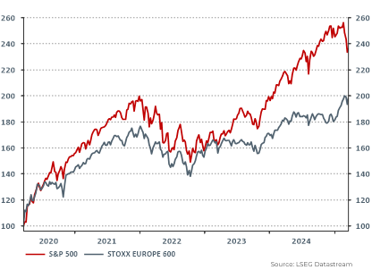 Le graphique ci-dessous montre l'évolution de l'indice américain S&P 500 (en dollars) et de l'indice boursier européen Stoxx 600 (en euros) depuis le début de l'année. Au cours des cinq dernières années, l'indice S&P 500 a surpassé l'indice européen Stoxx 600 en raison, entre autres, de la très bonne performance du secteur technologique américain.
