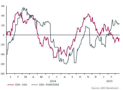 Les données économiques de ces derniers mois ont dépassé les attentes, comme le montre l'indice de surprise économique de la zone euro de Citigroup4, qui a bien rebondi depuis le mois de septembre 2024. L'indice américain, quant à lui, vient de chuter, comme le montre le graphique ci-dessous.