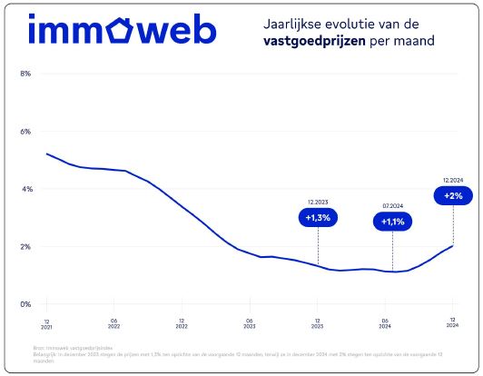 Sinds de rente in 2022 begon te stijgen, is de jaarlijkse prijsgroei aanzienlijk vertraagd. Begin 2023 daalde hij tot onder +2% en in juni en juli 2024 bereikte hij zijn laagste punt, met een stijging die beperkt bleef tot slechts +1,1%. De tweede helft van 2024 markeert echter een duidelijk keerpunt, met twee opeenvolgende kwartalen met elk een stijging van +0,6%. Over die zes maanden bedroeg de stijging dus +1,2%. Dit is aanzienlijk hoger dan in de tweede helft van 2023, toen de stijging slechts +0,3% bedroeg. "De daling van de rente en de stijging van de vastgoedkoopkracht hebben een boost gegeven aan de prijsstijgingen, die in 2024 +2% bedragen. Dit is aanzienlijk hoger dan de +1,3% stijging in 2023," vertelt Jonathan Frisch, econoom bij Immoweb. We moeten echter benadrukken dat ondanks dit herstel de groeiniveaus ver onder de niveaus van voor 2022 blijven.