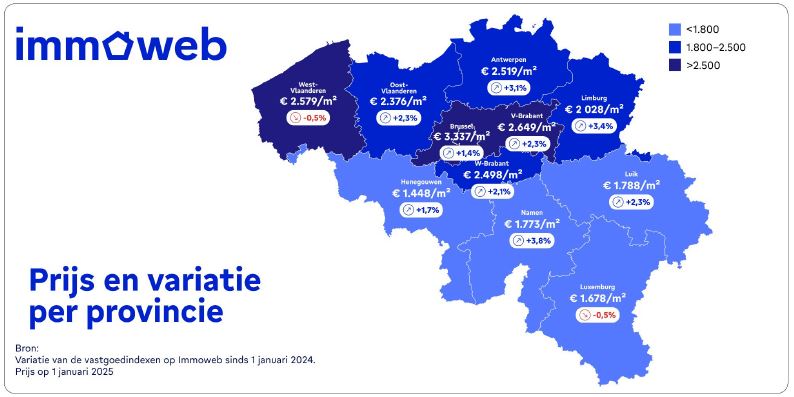 Limburg onderscheidt zich als de meest betaalbare provincie van Vlaanderen, terwijl het de sterkste prijsstijging van het Gewest over het jaar registreerde, met een stijging van +3,4%. Deze stijging werd echter overtroffen door die van de provincie Namen, waar de prijzen met +3,8% omhoog gingen over dezelfde periode. Daarentegen daalden de prijzen licht in de provincies Luik en West-Vlaanderen, met -0,5%.