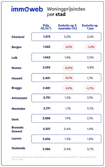 In 2024 waren er zeer contrasterende prijstrends tussen de grote Belgische steden. Om de prijzen en prijstrends in elke stad en gemeente in België te verkennen, raadpleeg je de interactieve prijskaart van Immoweb.