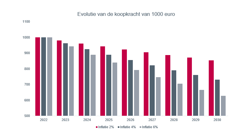 Een voorbeeld: in 2022 hebt u 1.000 euro op uw spaarrekening. Met een inflatie van bv. 4% op 8 jaar zal uw geld in 2030 nog slechts 731 euro waard zijn. Het voornaamste effect van inflatie is dat u door de jaren heen steeds minder producten kan kopen voor hetzelfde bedrag.