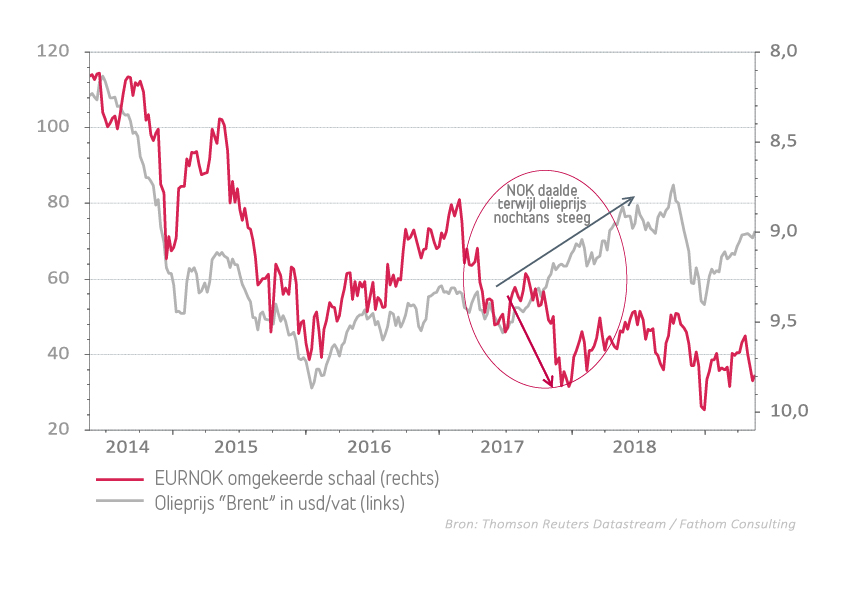 De Noorse kroon daalde de afgelopen 5 jaar met zo’n 20% tegenover de euro. Onder meer door de sterk gezakte olieprijs. Sinds begin 2016 herstelde de olieprijs en steeg de NOK in eerste instantie, maar vanaf februari 2017 verloor deze opnieuw terrein. Begin 2019 keerde de trend en steeg de Noorse kroon met 1,5% t.o.v. de euro.