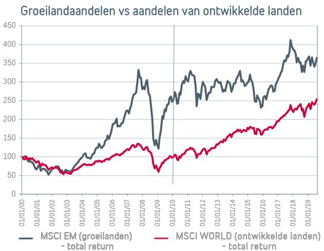 Het 1e decennium van deze eeuw was een bewogen periode voor aandelenbeleggers, met eerst de TMT-crisis (Telecom-Media-Technologie) en in 2008 de grote financiële crisis. Toch zetten groeilandaandelen in die periode een zeer sterke prestatie neer: de MSCI Emerging Markets, de toonaangevende index van groeilandaandelen, klom 162% hoger dankzij:
