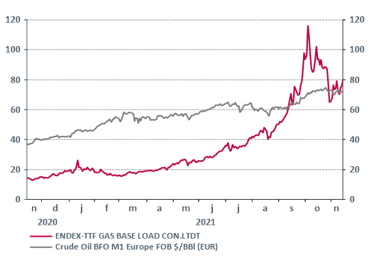 De hoge gasprijzen zijn ook het gevolg van de grotere vraag sinds het indammen van covid. Daarnaast stokt de bevoorrading uit Rusland en gaat Europa de winter in met historisch lage gasvoorraden wat zorgt voor de nodige nervositeit. Uiteraard speelt ook het weer een rol: minder zon en wind verplichten de elektriciteitsproducenten meer gas of olie te gebruiken. Nu beide brandstoffen zo duur zijn, stijgen ook de elektriciteitsprijzen.