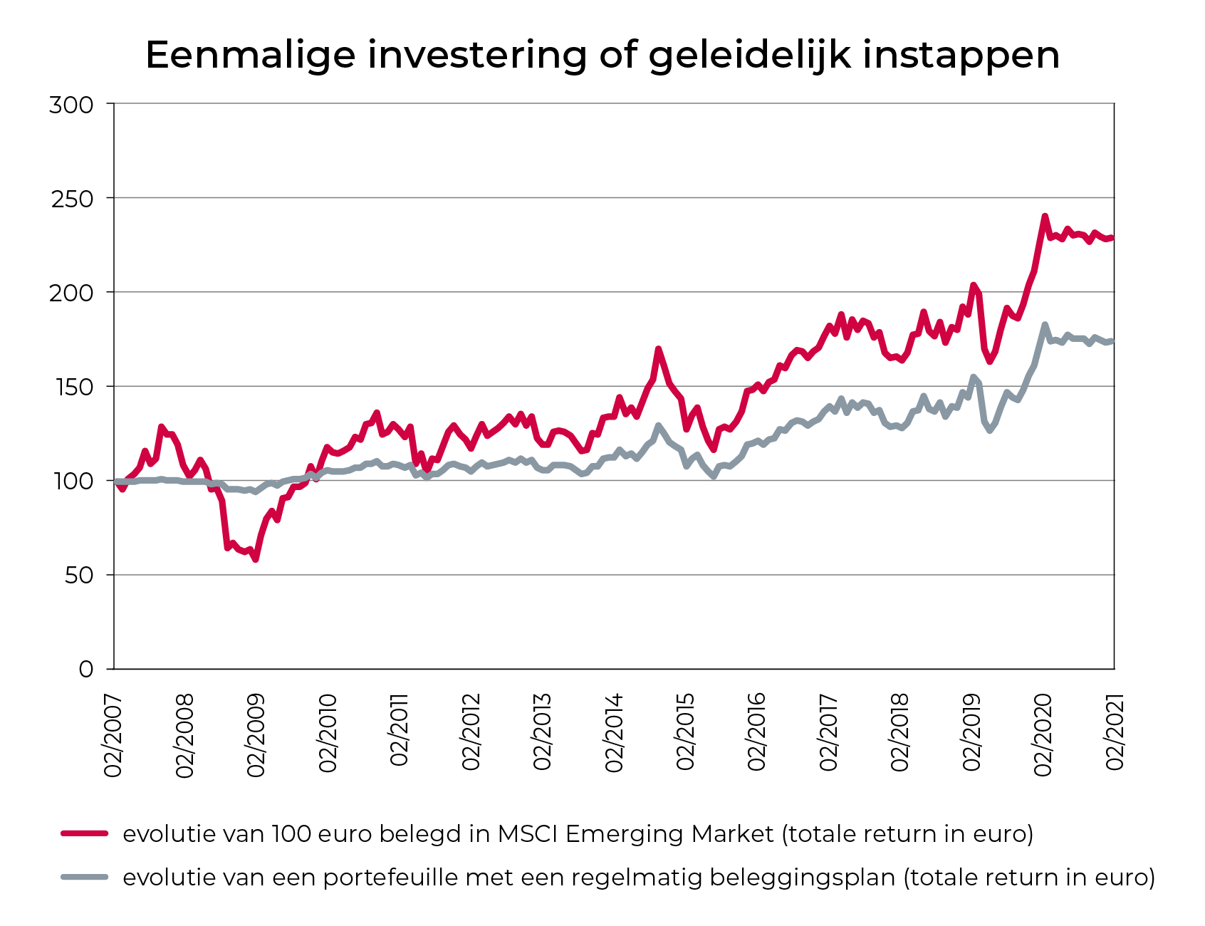 Veel mensen zijn ervan overtuigd dat beleggen een verstandige keuze is, maar de angst voor een marktcorrectie houdt hen tegen. Als u dat ook zo ervaart, kan een regelmatige belegging een interessante oplossing zijn. Want zo kan u de gemiddelde aankoopprijs afvlakken en de impact van de beursschommelingen beperken. Die strategie voorkomt dat er te veel wordt belegd op het verkeerde moment. Deze redenering geldt voor alle activaklassen en is zelfs nog relevanter voor volatiele activa, zoals aandelen uit groeilanden.