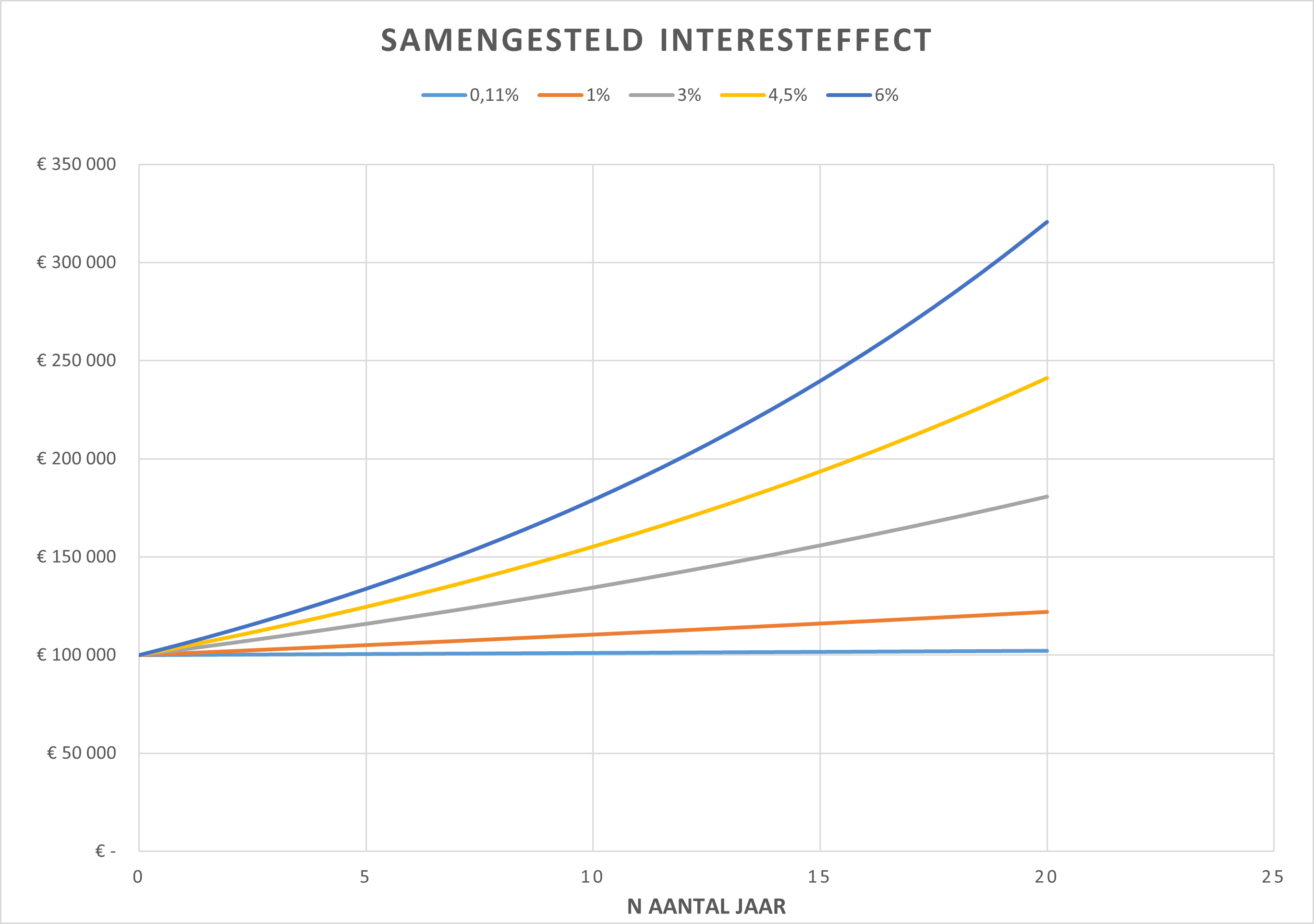 De tijd speelt een essentiële rol. Hoe langer men belegt, hoe beter het eindrendement kan zijn. Dit effect heet het samengestelde interesteffect en in de grafiek4 hieronder kan u de impact ervan zien. Onze tip: start zo snel mogelijk.