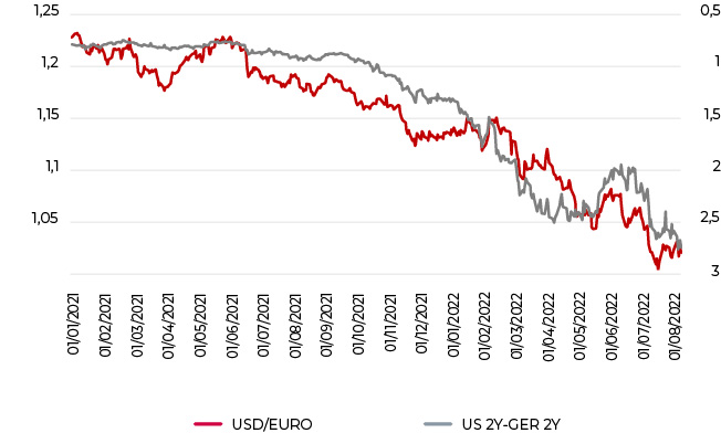 In Europa, waar de inflatie eveneens piekt, is de Europese Centrale Bank (ECB) veel voorzichtiger. Na jaren van status-quo is het proces van renteverhogingen pas gestart op 21 juli. De tragere en voorzichtigere aanpak van de ECB leidde tot een toenemend verschil tussen de Amerikaanse en de Duitse tweejaarsrente en tot een appreciatie van de dollar. Hoe groter het renteverschil, hoe gunstiger voor de USD.