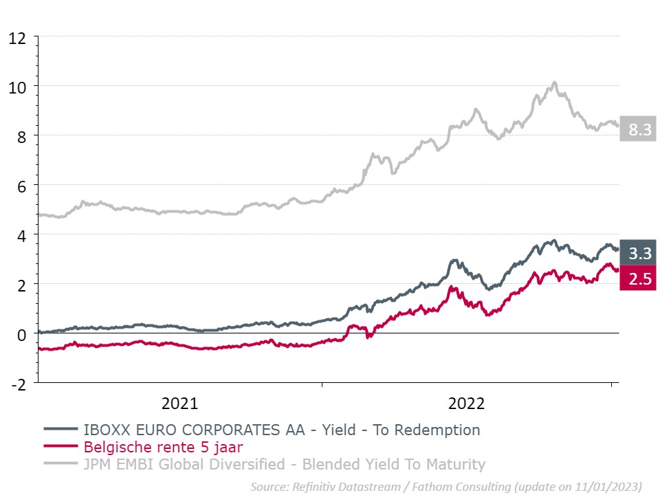De langetermijnrente wordt dan weer meer bepaald door het economisch groeitempo. Vertraagt de groei, dan is er minder vraag naar kredieten en kan deze rente dalen. Dat zagen we al in 2022. Na een initieel sterke stijging, daalde sinds midden oktober de tienjaarsrente met 0,50%1. Voor 2023 lijkt het stijgingspotentieel van de langetermijnrente eerder beperkt. Dat is op zich goed nieuws voor de obligatiebelegger. Daalt de rente, dan stijgt de koers van de obligaties in uw portefeuille.