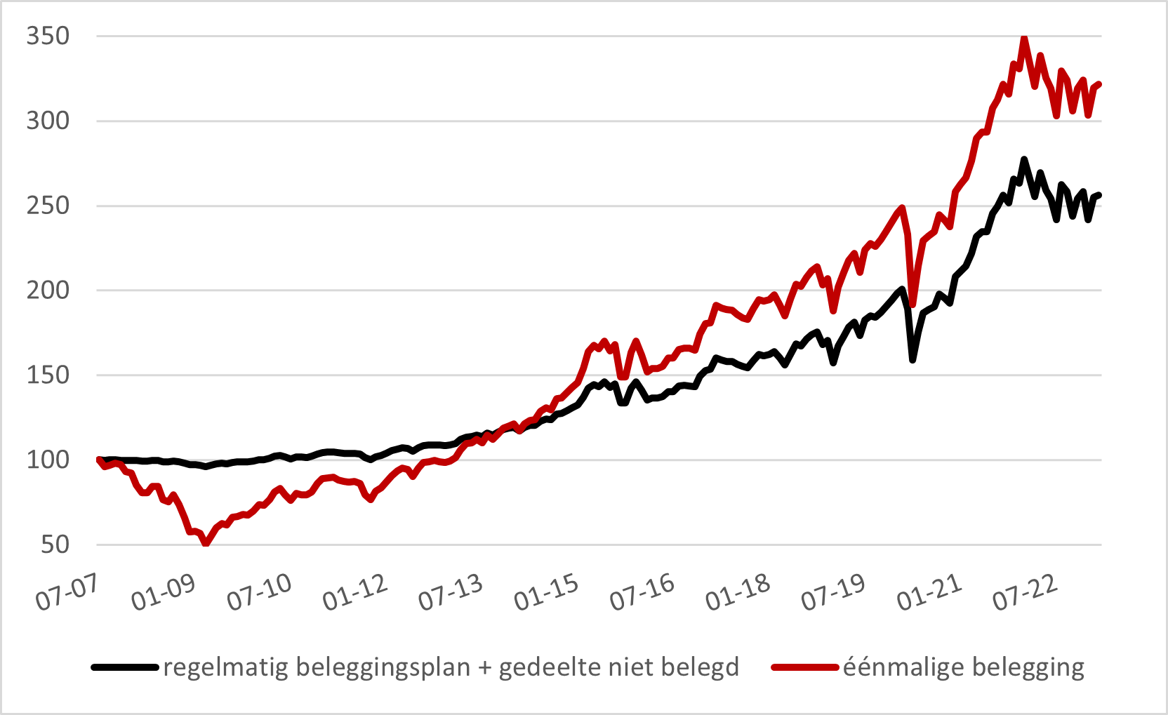 De grafiek2 hieronder toont de evolutie van een wereldwijd gespreide belegging in aandelen (MSCI World Total Return in euro). De rode portefeuille werd volledig belegd in juli 2007, toen de financiële crisis in alle hevigheid woedde. De zwarte portefeuille belegde hetzelfde bedrag, maar door middel van maandelijkse stortingen over de hele periode. Het niet-belegde gedeelte brengt helemaal niets op.