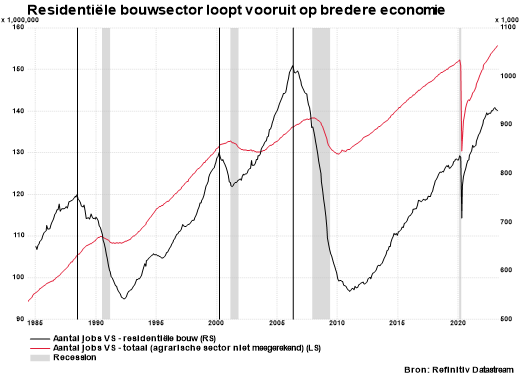Deze grafiek illustreert voor de VS het totale aantal jobs (rode lijn) en het aantal in de residentiële bouwsector. De grijze gebieden duiden een economische recessie aan.