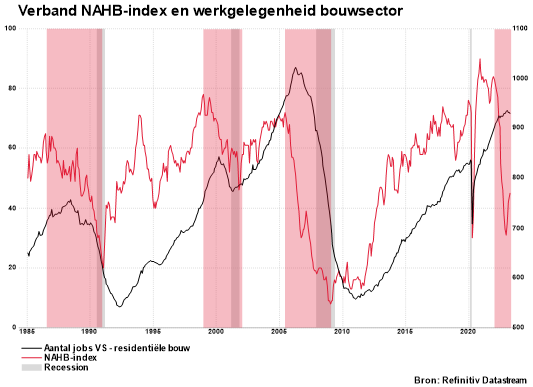 Neemt de werkgelegenheid in de residentiële bouwsector in de komende kwartalen effectief af, zoals de NAHB-index lijkt aan te geven, dan mogen we ons ook verwachten aan een toenemende werkloosheid in de bredere economie.