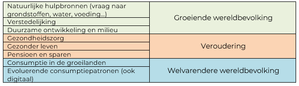 "De duidelijkste evolutie is dat de wereldbevolking nog een aantal decennia zal blijven groeien. Daarbovenop zet de verstedelijking zich steeds sneller door – vooral in groeilanden, maar ook in de VS. Intussen wordt de middenklasse in de groeilanden groter en rijker. Tot slot zien we een oudere wereldbevolking, waarbij zelfs de groeilanden niet ontsnappen aan de vergrijzing. Die ontwikkelingen hebben elk een verschillende impact op onze planeet en creëren nieuwe beleggingsopportuniteiten."