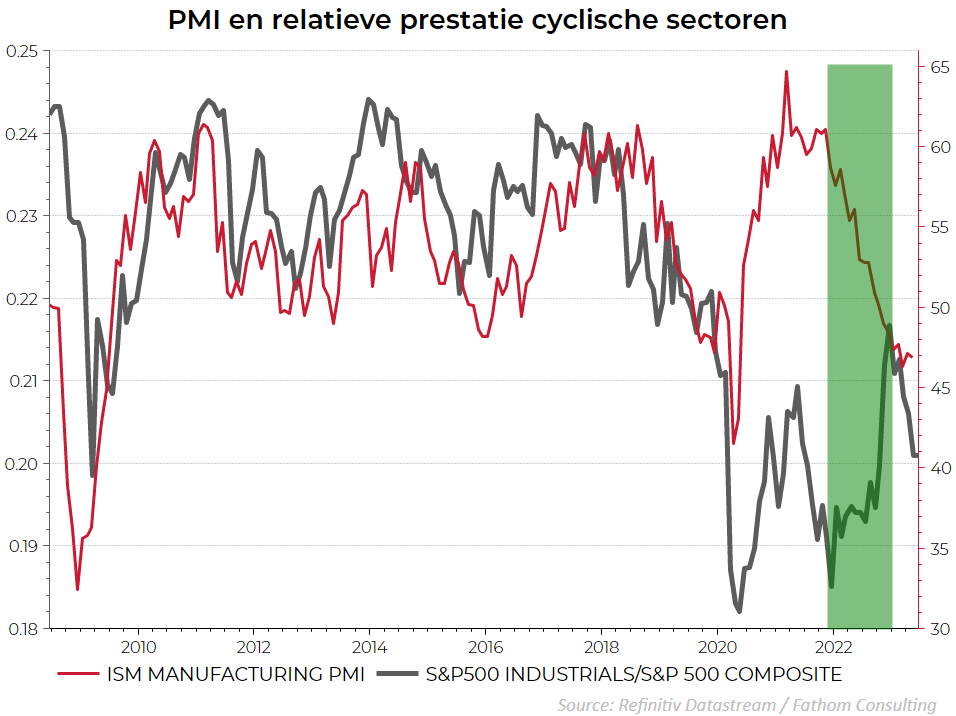 Waarom zijn de PMI’s niet alleen interessant voor economen, maar ook voor beleggers? De index geeft een goed beeld van de toekomstige bedrijfsactiviteit en vertoont een krachtige correlatie met de relatieve sterkte van bepaalde sectoren op de aandelenmarkt. Bevinden de PMI’s zich boven de 50, dan duidt dit op een expansie van de economie. Beleggers kiezen dan best voor meer cyclische sectoren die mee profiteren van deze betere economische vooruitzichten.