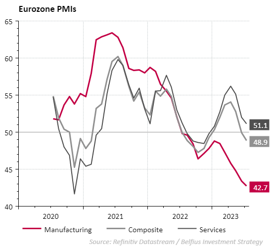 Sinds oktober vorig jaar is er in zowel de eurozone als de Verenigde Staten een verschil tussen de dienstensector en de industrie. Onderstaande grafiek toont aan dat de PMI’s van de industrie in de eurozone al een jaar onder de 50 liggen. De dienstensector daarentegen scoort sinds begin dit jaar opnieuw structureel boven de 50. Deze divergentie, een zwakke industrie maar sterke dienstensector, heeft ertoe geleid dat de economie in de eerste helft van dit jaar beter heeft gepresteerd dan voorspeld door veel analisten.