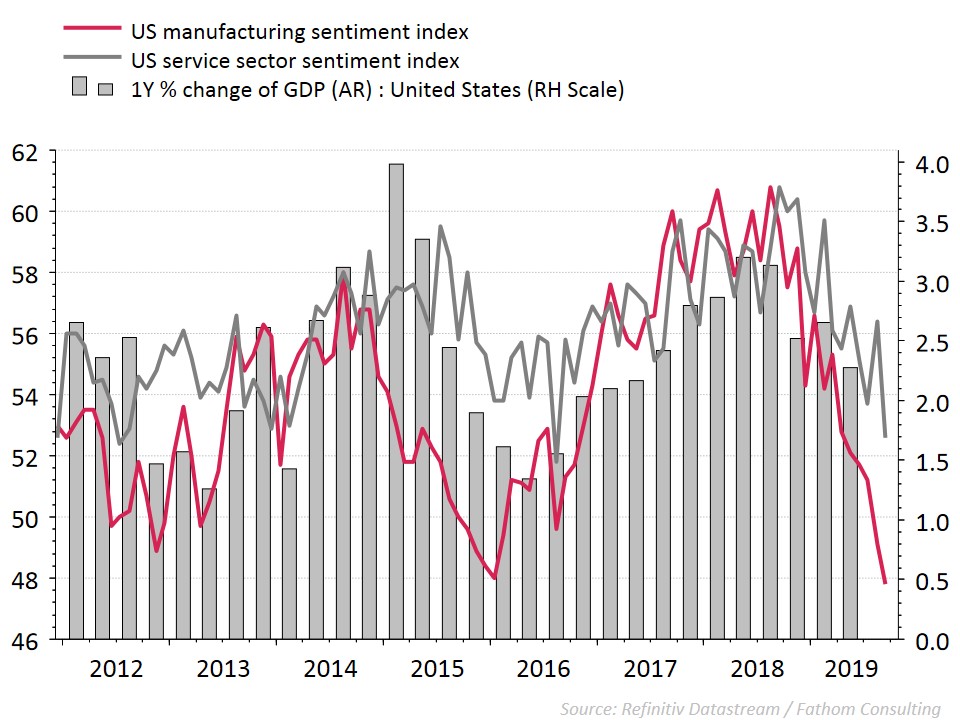 Het economisch sentiment bij de industriële bedrijven nam een forse duik in oktober naar het laagste niveau in tien jaar tijd. Toenemende bezorgdheid dat het handelsconflict met China weegt op de export vanuit de V.S., duwde de vertrouwensindex van de verwerkende nijverheid naar 47.8. Het was de tweede maand op rij dat de index onder de grens van 50 punten noteerde, wat wijst op een industriële recessie in de grootste economie van de wereld.