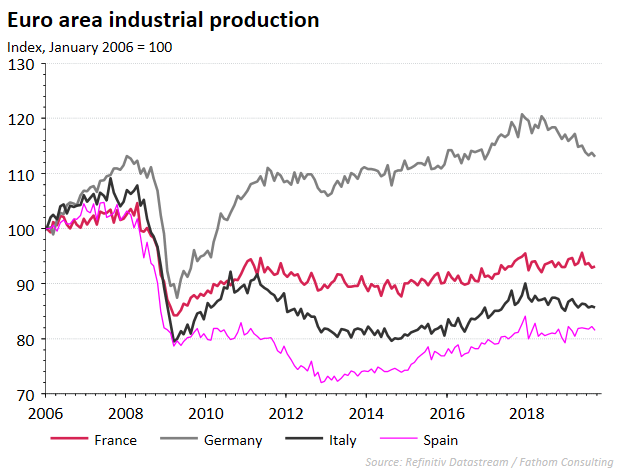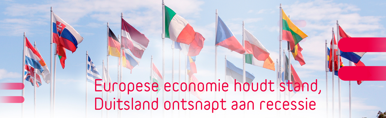 Maar de groei in de Eurozone blijft dus laag, hoewel het totaalcijfer vooral naar beneden getrokken wordt door de Duitse groeivertraging. Duitsland, tijdens de afgelopen jaren de motor van de Europese economie, stevende af op een recessie. Na een negatieve groei in het tweede kwartaal, werd ook een krimp in het derde kwartaal verwacht, wat voldoende is om van een technische recessie te kunnen spreken. Dat de Duitse industriële productie tijdens de maanden juli tot september gemiddeld daalde met 4,5% beloofde niet veel goeds, maar dankzij een goed presterende bouwsector, overheidsuitgaven en een sterke consumptie werd een recessie dus nipt vermeden.
