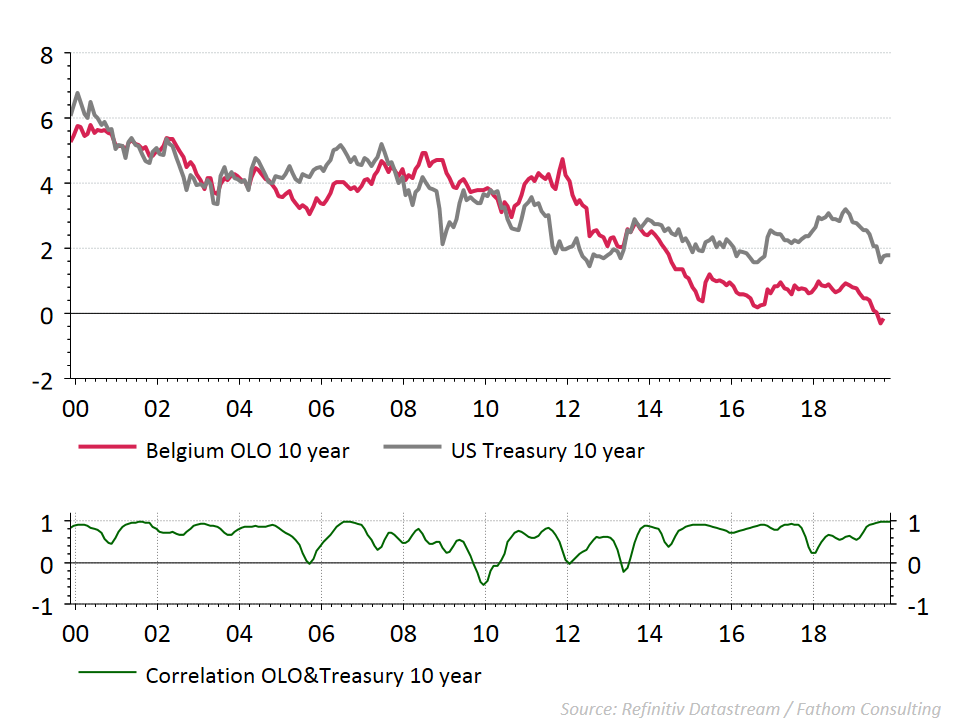 Wij verwachten dat de correlatie tussen de Europese en de Amerikaanse rentevoeten volgend jaar gehandhaafd blijft in de buurt van 1. De evolutie van de langetermijnrente in de eurozone zal dus afhangen van het wereldwijde macro-economische scenario.