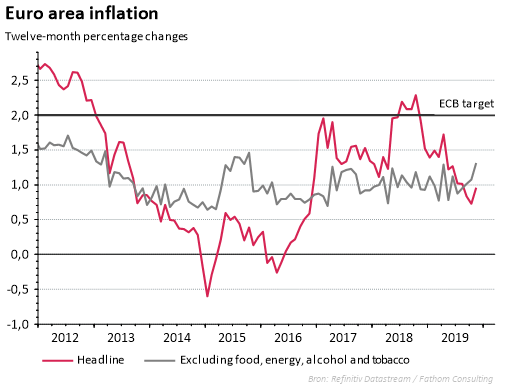 De voorbije jaren hebben de inflatievoorspellingen van de ECB de gerealiseerde inflatie steeds overschat. De huidige prognose is dat de inflatie, na een vertraging in 2019 en 2020, terug zal opveren naar 1,4% in 2021 en 1,6% in 2022. Gegeven het verleden lijkt deze prognose opnieuw niet erg geloofwaardig. Financiële markten bijvoorbeeld geloven er niet meer in. Zij verwachten een zeer lage inflatie op lange termijn en zelfs een deflatie op korte termijn.