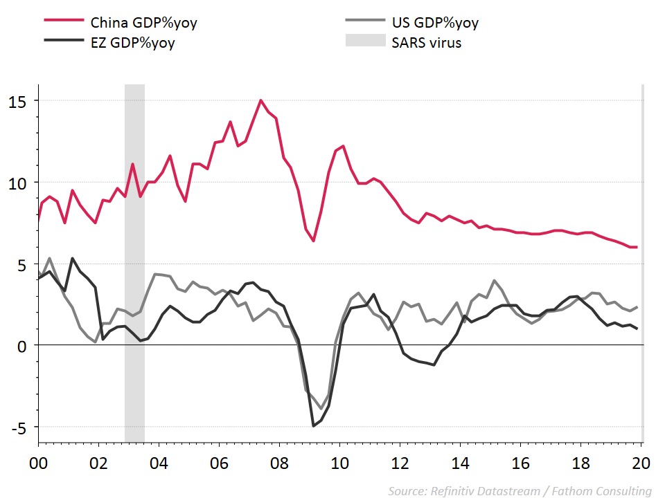 Hoeveel lager de Chinese groeicijfers precies zullen liggen is nog niet duidelijk. Veel experts verwijzen naar de SARS- epidemie (november 2002- juni 2003) als referentie, maar deze keer is het potentieel voor economische schade aanzienlijk groter. China is anno 2020 een veel belangrijkere speler in de wereldeconomie. Bovendien is het land intussen heel wat afhankelijker geworden van dienstverlening en privé-consumptie. Ook zijn de omstandigheden vandaag minder gunstig dan in 2003. Na de groeidip van 2001 zat China en de rest van de wereld in een positieve economische conjunctuur (zie grafiek). De Chinese economie kon optimaal profiteren van haar kersverse lidmaatschap van de WHO en de vrijhandel die daarop volgde. Nu zitten we in een situatie waarin die vrijhandel in vraag wordt gesteld door de handelsspanningen met de V.S. De coronavirus epidemie komt dus op een moment dat de Chinese economie kwetsbaar is.
