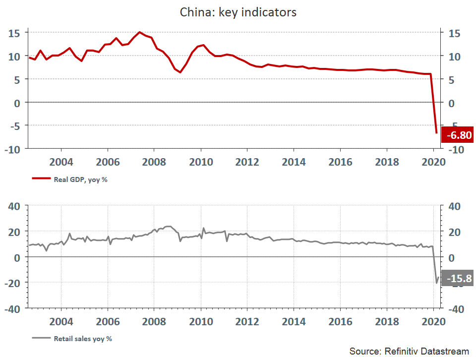 Eindelijk hebben we een duidelijker beeld van wat een lockdown door het Covid-19 virus betekent voor de economische groeicijfers van een land. Voor het eerst sinds 1992 kijkt de Chinese economie aan tegen een krimp van de economie. In het eerste kwartaal van dit jaar daalde het BBP met 6,8% t.o.v. dezelfde periode in 2019 omdat het grootste deel van de economie non-actief was door strenge quarantaine maatregelen. Na de uitbraak van het Covid-19 virus in de provincie Wuhan, was China het eerst om de samenleving onder lockdown te plaatsen en ook het eerst om de stringente maatregelen op te heffen. Hierdoor is de Chinese economie een leidende indicator voor de directe impact van de pandemie op de BBP-cijfers in de eurozone en het soort herstel dat we mogen verwachten in de loop van 2020.