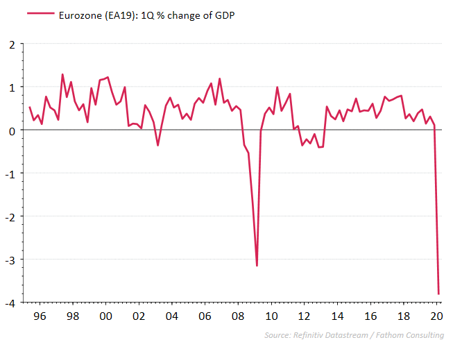 Zoals gevreesd deelt de covid-19 pandemie in het eerste kwartaal een harde oplawaai uit aan de Europese economie. Het BBP van de eurozone krimpt 3,8% in vergelijking met het voorgaande kwartaal, de zwaarste daling (op kwartaalbasis) in de geschiedenis van de monetaire unie. In Frankrijk, waar strenge lockdown maatregelen van kracht zijn, daalde de economische activiteit met maar liefst 5,8%, terwijl in ons land een daling van 3,9% werd genoteerd.