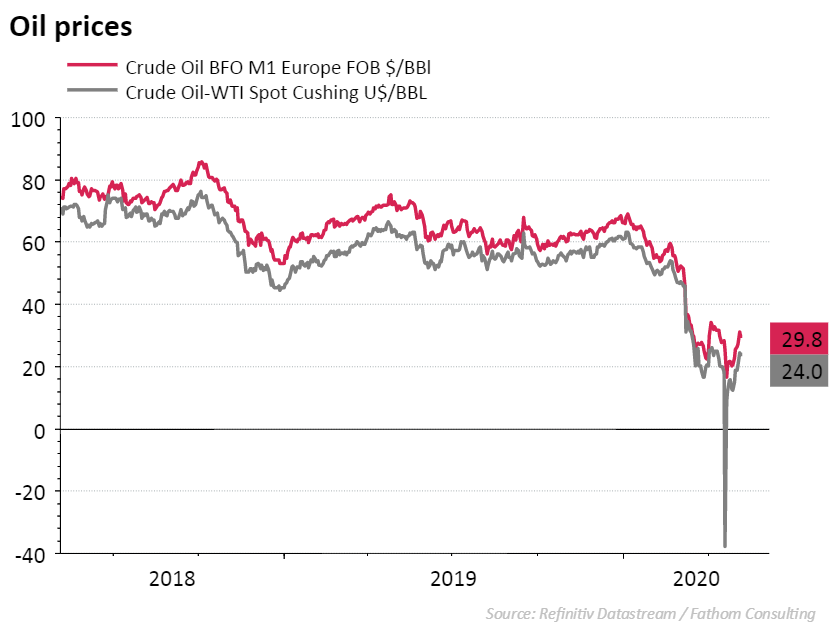 De OPEC landen en Rusland kwamen tot een deal om vanaf 1 mei de output te beperken wat de verkoopsdruk wat doet afnemen. Ook de geleidelijke heropening van de economie in China, de eurozone en delen van de V.S. zorgde voor een opwaartse correctie op de oliemarkt, maar een vat ruwe olie is nog steeds meer dan de helft goedkoper dan bij de start van 2020. Door de covid-19 crisis en de opgelopen economische schade zal de vraag ook de rest van het jaar ondermaats blijven. Het Internationaal Energie Agentschap (IEA) verwacht dat de wereldwijde vraag naar olie in 2020 zal dalen met 9,3 miljoen vaten per dag (ongeveer 10% lager dan in 2019) door de pandemie.