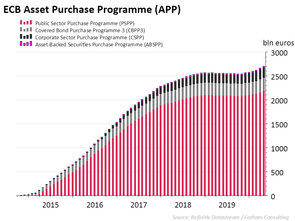 De enorme obligatie aankopen zijn onderdeel van het onconventioneel monetair beleid van de ECB waarmee ze de inflatie in de eurozone probeert richting 2% te duwen. In de nasleep van de financiële crisis van 2008 begonnen de centrale banken in Europa, de V.S. en Japan massaal overheidspapier op te kopen. De ECB heeft ondertussen al voor 2.200 miljard euro aan staatsschuld opgekocht via PSPP (zie grafiek). Het beleid is in het noorden van de eurozone, maar vooral in het spaarzame Duitsland omstreden. De ECB-aankopen zorgen voor lagere rentes in de eurozone, waar landen met veel staatsschulden (zoals Italië en Griekenland) van profiteren. Maar er zijn ook nadelen: de lage rentes wegen op de rentabiliteit van de bankensector en doen de rente-inkomsten voor spaarders en institutionele beleggers opdrogen.