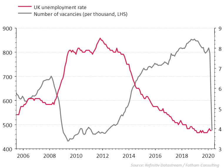 Hoe duurzaam dat herstel zal zijn, hangt in grote mate af van hoeveel schade de Britse arbeidsmarkt dit jaar oploopt. Het systeem van tijdelijke werkloosheid dat de regering van Boris Johnson als noodmaatregel heeft ingevoerd zorgt voor een buffer en beperkt de schade voor de jobmarkt op korte termijn. Een ander voordeel is dat de werknemers aan hun werkgever verbonden blijven en een snelle overgang naar het werk vergemakkelijken zodra de vraag weer aantrekt. Maar de regeling loopt af in de loop van het vierde trimester en het is best mogelijk dat de werkloosheid dan wel serieus aantrekt. Sinds januari is er een scherpe daling van het aantal vacatures (zie grafiek) te zien, normaal gezien een voorbode van oplopende werkloosheid.