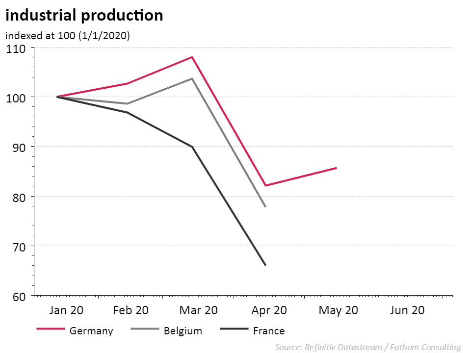 Uit de grootste economie van de eurozone komen er steeds meer signalen dat het ergste van de industriële recessie achter de rug is. Maar een terugkeer naar de situatie van voor Covid-19 is nog niet aan de orde. In mei herstelde de Duitse industriële productie met 7,8% na een daling met 17,5% de maand ervoor. Duitsland kreeg – net als de rest van de eurozone – in maart en april door het vergrendelen van de economie te maken met de grootste krimp van de industrie sinds het begin van de metingen in 1991.