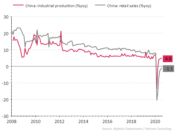 In juli daalde de verkoop in de detailhandel voor de zevende maand op een rij, een ontgoocheling voor de financiële markten, die uitkijken naar signalen dat de Chinese consumenten stilaan de draad weer oppikken. Het herstel in China is tot nu toe vooral te zien aan de aanbodkant van de economie. De heropstart van de fabrieken vertaalde zich vanaf maart in een snelle remonte van de bedrijfsactiviteit. In juli versnelde de jaargroei van de industriële output verder naar 4,8% (zie grafiek). De tegenvallende verkoopcijfers van juli bevestigen echter dat de consumentenvraag duidelijk achterna hinkt in het economisch herstel. Het vertrouwen herstelde wel in het tweede kwartaal door het lage aantal nieuwe Covid-19 besmettingen op Chinees grondgebied, maar onvoldoende om de kleinhandel uit de rode cijfers te halen.