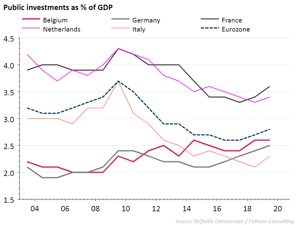 Op korte termijn moet de verhoging van de publieke investeringen de economische groei opnieuw aan de praat krijgen. In de huidige crisis komt een herstel van de vraag bij de bedrijven en de gezinnen immers maar moeilijk van de grond. Het lukt ook onvoldoende om de economie aan te zwengelen via het monetair beleid van de ECB, wat de rol van de overheden als katalysator van de groei in de schijnwerpers zet.