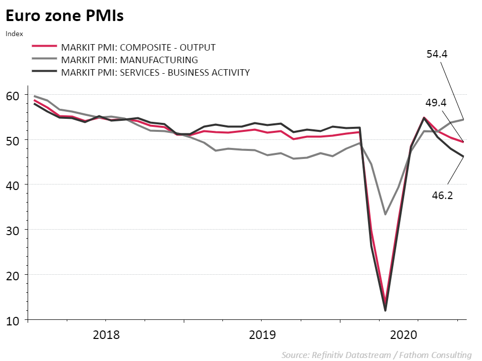Volgens de bedrijven ziet het jaareinde er niet goed uit nu een tweede golf van Covid-19 besmettingen over de eurozone raast. De index van het Europese ondernemersvertrouwen geeft aan dat bedrijven denken dat hun activiteit weer zal dalen. Vooral de ondernemers in de dienstensector zijn pessimistisch, terwijl het industrieel vertrouwen standhoudt (zie grafiek).