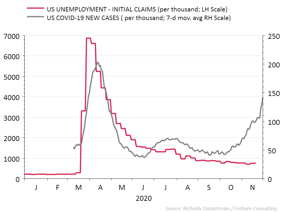 Terwijl Wall Street feest viert, is Covid-19 aan een nieuwe opmars bezig in de States, en hebben veel staten de veiligheidsmaatregelen weer opgedreven. De beperkingen zijn minder streng dan in het voorjaar maar de recente opstoot aan besmettingen zal op korte termijn toch gaan wegen op de Amerikaanse economie. De daling van het aantal werkloosheidsaanvragen is al een tijdje voorbij (zie grafiek 1) en het risico dat de derde Covid-19 golf zorgt voor een nieuwe golf ontslagen in de horeca en de vrijetijdssector, is duidelijk toegenomen.