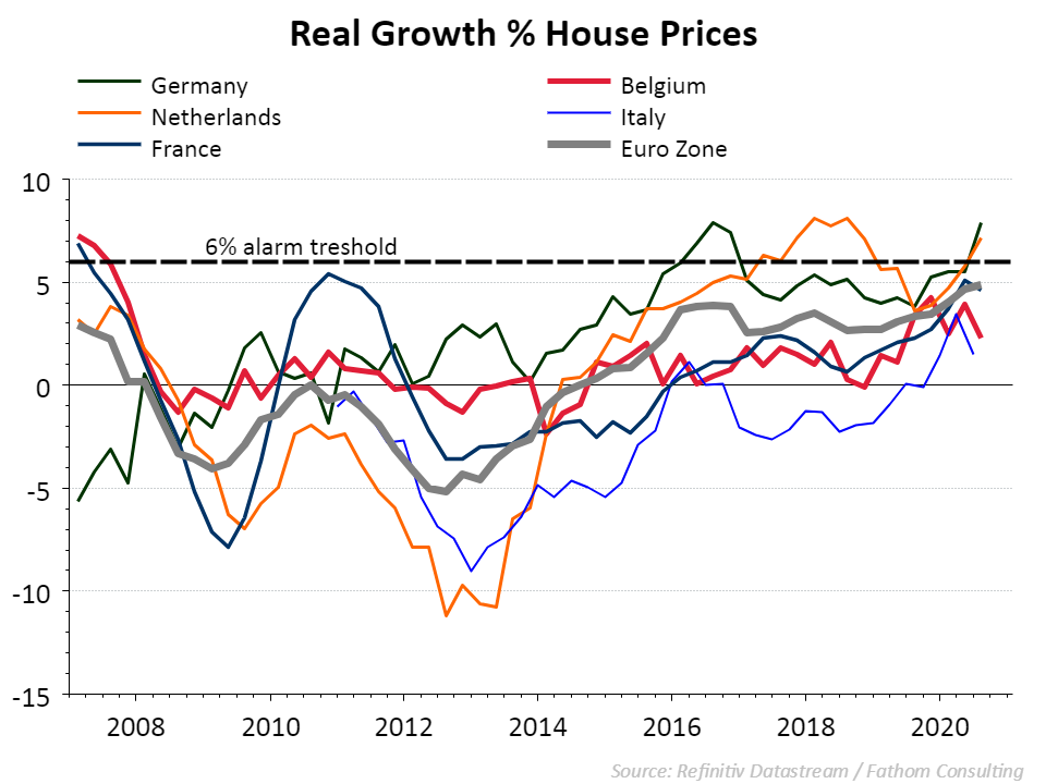 De combinatie van deze steunfactoren heeft in 2020 zowel in België als in de ons omringende landen gezorgd voor een verrassend sterke klim van de huizenprijzen. De vastgoedinflatie in de eurozone zit sinds 2014 duidelijk in de lift en de prijsstijgingen van het afgelopen jaar doen stilaan de vrees voor een oververhitting de kop opsteken. De Europese toezichthouders houden de ontwikkeling van de vastgoedprijzen in de gaten in het kader van de ‘Macro-economic Imbalance Procedure (MIP)’. Die is bedoeld om macro-economische onevenwichtigheden op te sporen, die een negatieve invloed kunnen hebben op de economische stabiliteit in een bepaald land of de EU als geheel. Op het vlak van vastgoed wordt gekeken naar de reële vastgoedinflatie. Dat is de nominale (echte) groei van de vastgoedprijzen min de inflatie. Of anders gezegd: hoeveel sneller stijgen de huizenprijzen in vergelijking met de inhoud van het winkelmandje?