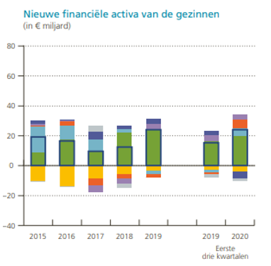 Maar het spaarboekje is momenteel een verliespost. Door de inflatie verliest het geld aan koopkracht, wat niet gedekt wordt door de lage rentevergoeding. Daarom vond ook een groot deel van het geld zijn weg naar aandelen en deelbewijzen van beleggingsfondsen. Tijdens de eerste drie kwartalen van 2020 investeerden de gezinnen voor respectievelijk 5,6 en 5,5 miljard euro in aandelen en beleggingsfondsen. Ook de sterke beursdaling in maart zat hier voor iets tussen, aangezien vele kleine beleggers dit als een koopopportuniteit zagen. Tenslotte deed men obligaties van de hand (-3,6 miljard) en daalde ook de interesse voor verzekeringsproducten en andere financiële activa (zie grafiek).