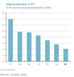 Voor die ruimere verspreiding van digitale tools is de scholing van arbeidskrachten cruciaal. Helaas zitten we daar met een probleem. Het aandeel Belgen met een ICT-diploma ligt onder het gemiddelde van de EU én onze buurlanden. Ondernemingen en overheid kunnen dus best werk maken van hogere opleidingsinspanningen zodat veel meer werknemers met die technologieën kunnen werken. Ondanks alle federale en regionale initiatieven om deze lacune op de arbeidsmarkt weg te werken, zien we geen substantiële verbetering, zo stelt de Nationale Bank.
