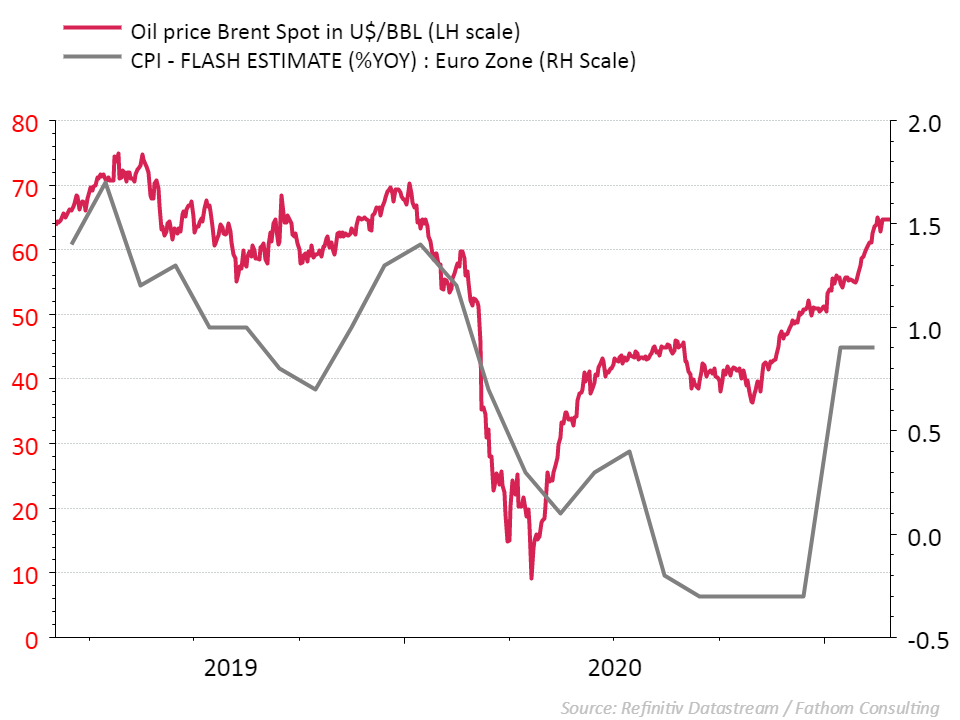 Door de klim van de grondstoffenprijzen zal de inflatie in de eurozone wellicht verder oplopen. In april van vorig jaar stond de olieprijs op haar dieptepunt, maar sinds die tijd is een vat olie bijna 80 procent duurder geworden. Ook de prijzen andere materialen zoals koper, hout en halfgeleiders zijn aan een opmars bezig. Zodra de economie in de lente weer geleidelijk aan opengaat mogen we ook prijsverhogingen verwachten in de dienstensectoren. Denk aan reizen en kleding bijvoorbeeld. De algemene inflatie in de eurozone kan hierdoor in de tweede jaarhelft een piek bereiken van 1,7 procent.