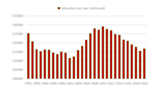 Dat is te wijten aan de daling van het gemiddeld aantal kinderen per vrouw, ook het vruchtbaarheidscijfer genoemd. Dat cijfer blijft de komende vijf jaar onder 1,6, ruim onder het niveau van 2,1 dat nodig is om voor generatievervanging te zorgen.