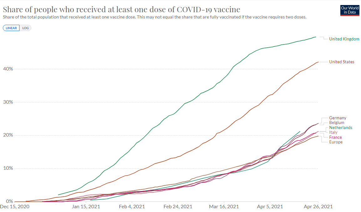 Van bij de start loopt het mis met de inentingen in de EU. Getalm met de goedkeuring van vaccins op Europees niveau, het tekort aan leveringen en een trage uitrol zetten Europa op grote achterstand in vergelijking met landen als de VS en het VK. In de Europese Unie heeft ongeveer één vijfde van de bevolking ten minste één dosis gekregen. In Amerika en het VK is dat meer dan het dubbele (zie grafiek). Dat zorgt ook voor een grote kloof in termen van economische groei. In de V.S. zet de snelle introductie van de vaccins en een vrachtlading fiscale steun de economie op weg naar de sterkste groei in jaren. De Amerikaanse economie zit op schema om nog vóór de zomer alle economische schade van de Covid-19 crisis in te lopen. De meeste landen van de eurozone zullen deze mijlpaal pas in 2022 bereiken.