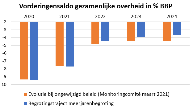 Het geplande begrotingstraject baseert zich op de inspanning die voorzien is in het federale regeerakkoord van september vorig jaar. Die bestaat uit een beperkte vaste verbetering van de begroting met 0,2% van het BBP per jaar. Daarnaast zal er vanaf 2022 een bijkomende variabele inspanning geleverd worden van rond de 0,2% BBP indien de economie voldoende hersteld is van de Covid-19 crisis. Het is een goed idee om de begrotingsinspanning afhankelijk te maken van het economische herstel. Té snel starten met bezuinigen zou onze economie opnieuw in een recessie kunnen doen belanden. Maar te laat reageren doet de schuldgraad nóg verder oplopen en brengt de houdbaarheid van de openbare financiën in het gedrang. Het is duidelijk dat het begrotingsbeleid voor de komende jaren een moeilijke evenwichtsoefening wordt.