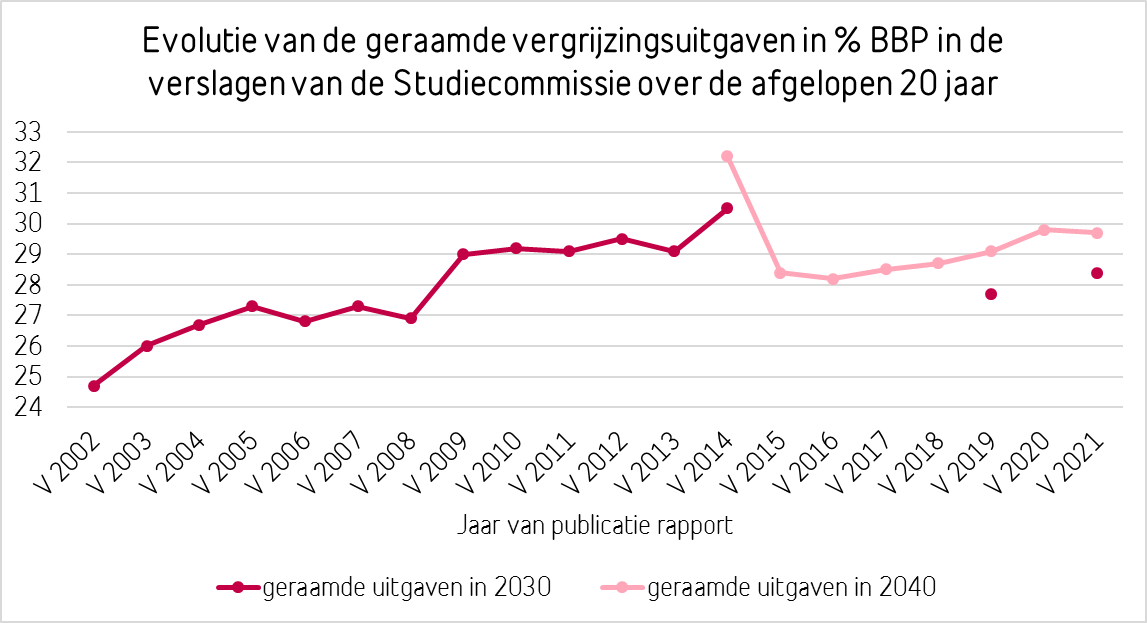 Alle ogen zijn dan ook gericht op de pensioenhervorming die minister van pensioenen Carine Lalieux in september op tafel zal leggen. De reactie van de minister op het rapport van de Vergrijzingscommissie doet het ergste vermoeden voor de begroting. Ze minimaliseert de kosten en stelt dat langer leven en waardige pensioenen een succes zijn. Nochtans is een pensioenhervorming nodig om de kosten te reduceren. Het effect hiervan kan groot zijn. Dit zien we in onderstaande grafiek, die een overzicht geeft van de ramingen van de vergrijzingskosten in de jaarlijkse verslagen van de vergrijzingscommissie over de afgelopen 20 jaar.
