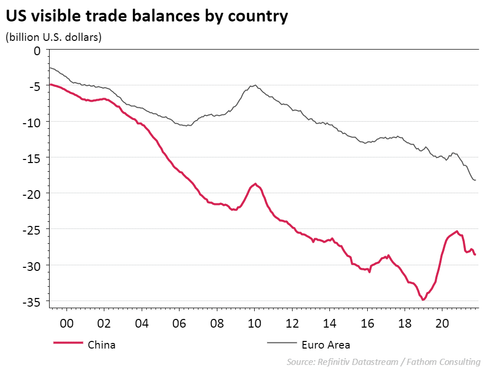 De dollar zal ook wat van zijn pluimen laten na de zomer. Tijdens de lockdown van 2020 maar ook in het herstel erna is in de V.S. de vraag naar buitenlandse goederen fors gestegen. Hierdoor is het tekort op de Amerikaanse handelsbalans snel opgelopen, vooral met de eurozone (zie grafiek). Dat kan in de loop van 2022 beginnen wegen op de dollar. De klim van de grondstoffenprijzen ondersteunde dit jaar de vraag naar dollars maar volgend jaar zal dat effect wegvallen in de tweede jaarhelft. We zien daarom de euro herstellen naar 1,14 dollar tegen het einde van 2022.