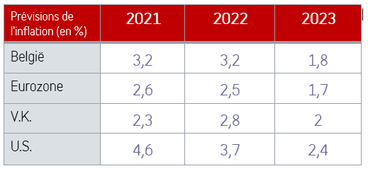 Door deze factoren zal het volgens ons langer duren dan eerder gedacht voor de inflatie in de eurozone echt afkoelt. In zowel België, Nederland en Duitsland blijven de prijzen volgend jaar groeien aan een tempo van 3 procent of meer. We zien de inflatiecijfers voor de volledige eurozone ten vroegste in de herfst onder de grens van 2 procent duiken en houden rekening met een gemiddelde van 2,5% in 2022. In 2023 daalt het jaargemiddelde richting 1,7 procent. Dat is een stuk hoger dan de inflatie die we gewoon waren van vóór Covid-19. In de periode 2013-2019 groeiden de consumentenprijzen per jaar gemiddeld slechts 1 procent.